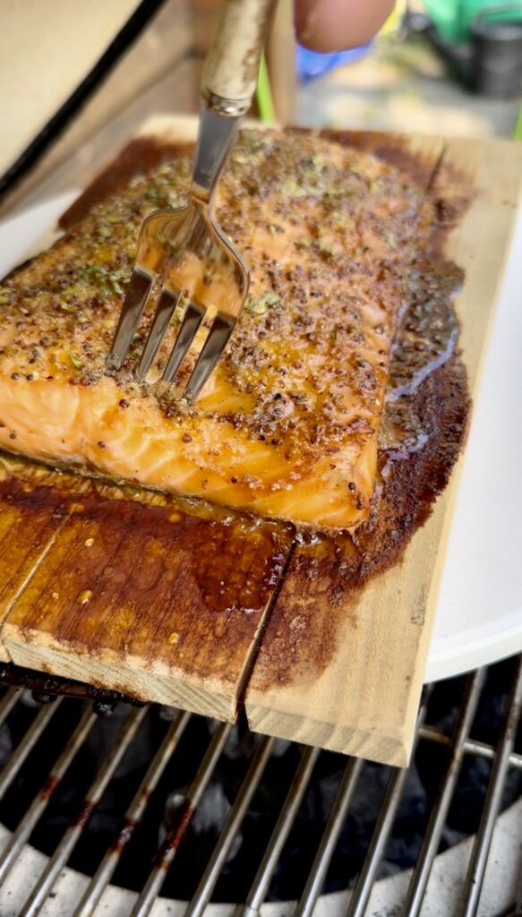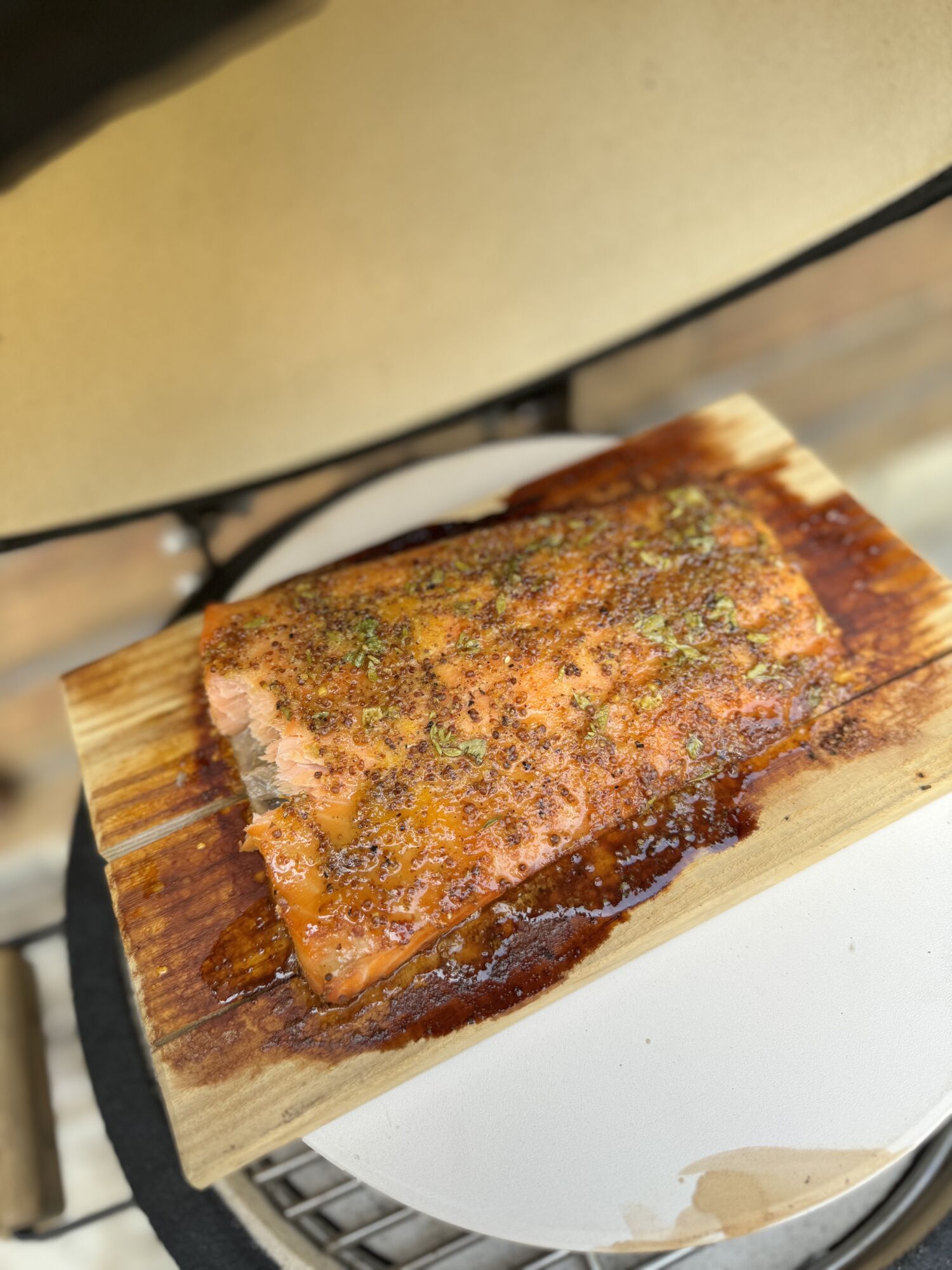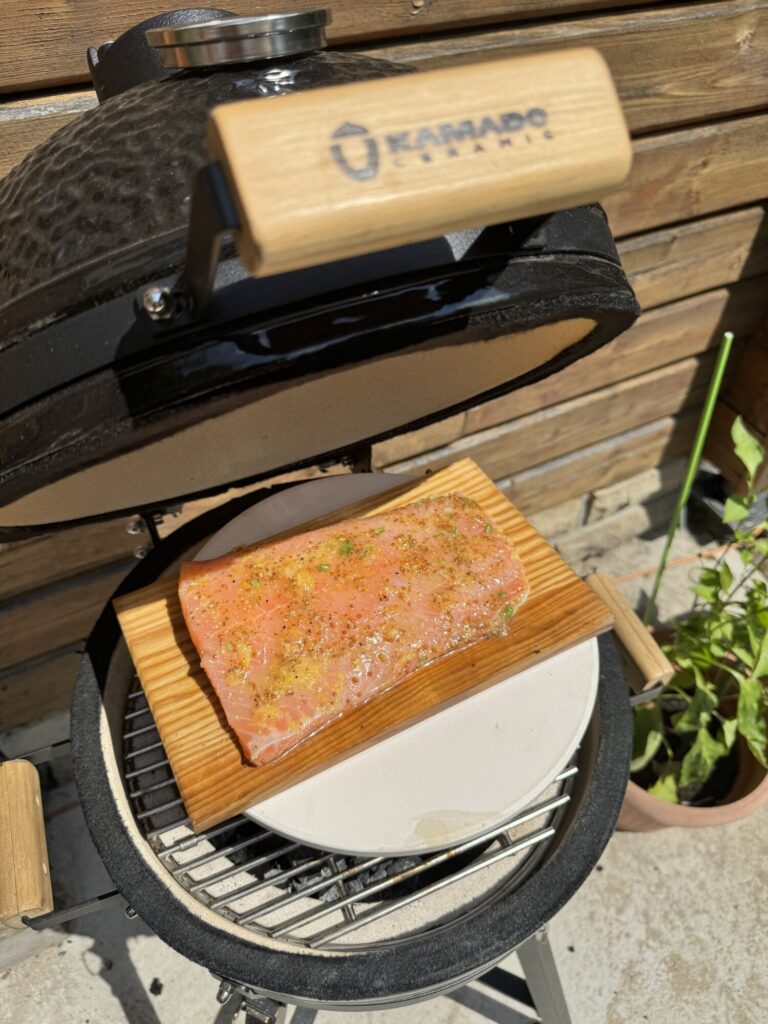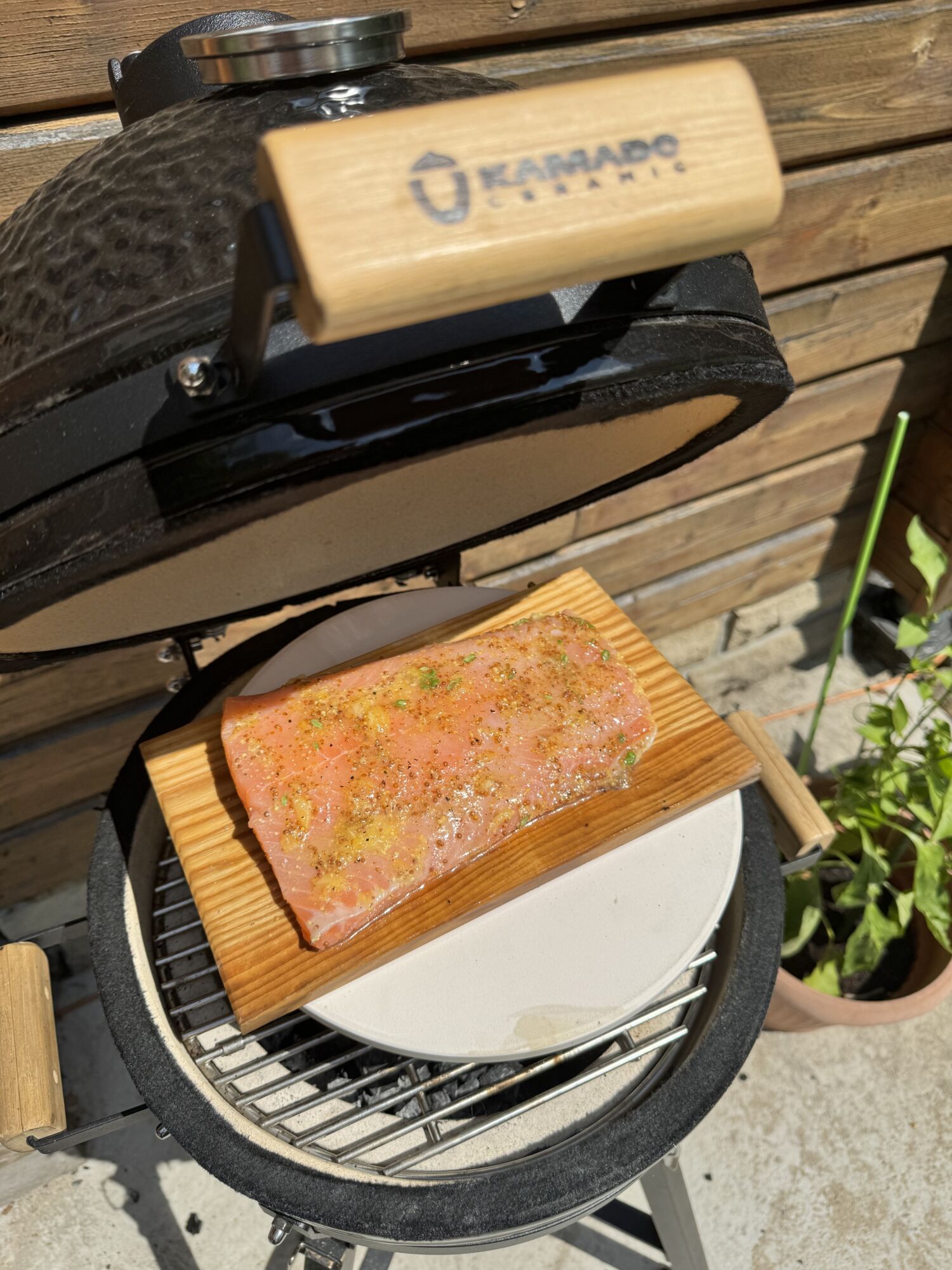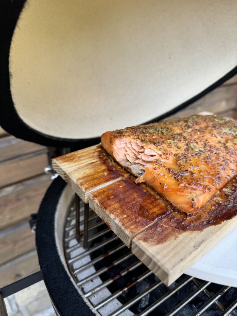 4. Hotového lososa opatrně sejměte z prkna, přesuňte na servírovací talíř a podávejte s čerstvým citronem, bylinkami nebo lehkým salátem.