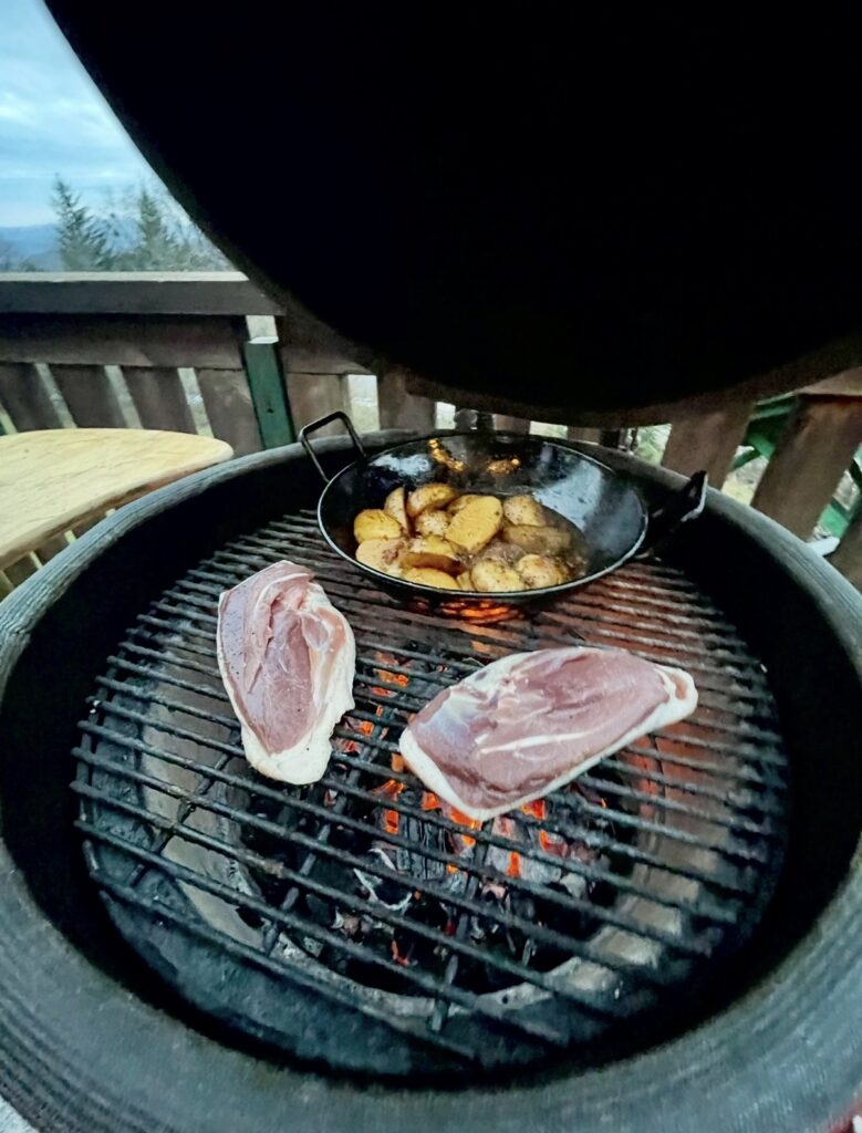 Gril předehřejte na 180 °C. Brambory i s nálevem přendejte do smaltovaného (španělského) kotlíku a umístěte je na kraj grilu. Za občasného promíchání je nechte dusit. Po 25 minutách přidejte kachní prsa, položte je kůží dolů a zprudka je opečte asi 5 minut, aby se tuk vyškvařil a maso zatáhlo. Poté prsa dopékejte dalších 10 minut po stranách grilu, s otočením po 5 minutách.