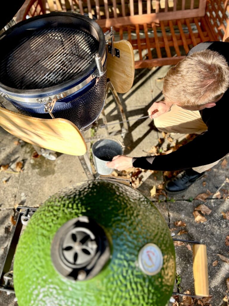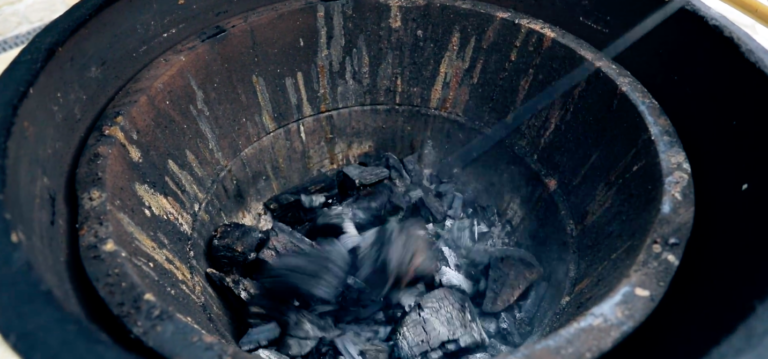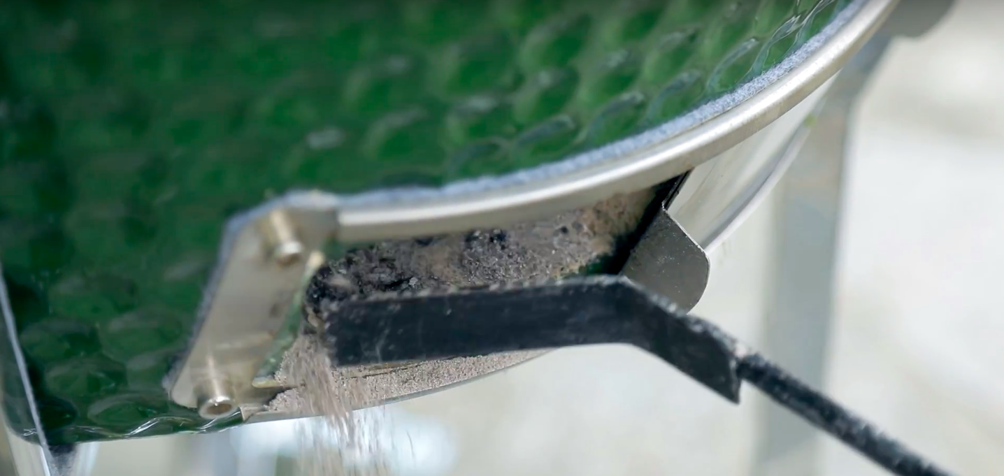 Potřebujete k tomu pohrabáč. Nejlépe náš KAMADO ceramic© a nádobu na popel. Idelní je kovový kyblík. Sundáte kovový rošt a zbytky dreveneho uhlí důkladě prohrabete aby popílek propadl přes litinový rošt do popelníku. Pohrabáčem jednoduše veškerý popel vyhrabete do kyblíku. A hůrá můžeme zase grilovat. Zde podrobný videonávod na čištění grilu.