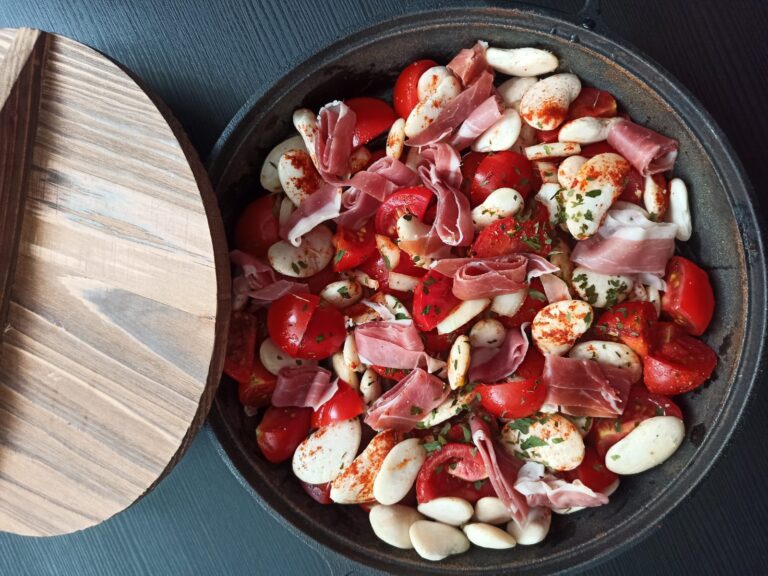 Tento vydatný recept na anglickou snídani je plný chutí a ideální pro začátek dne. Kombinace fazolí, rajčat, pršutu a vajec je skvělým způsobem, jak si dopřát energii a skvělý zážitek při každém soustu!