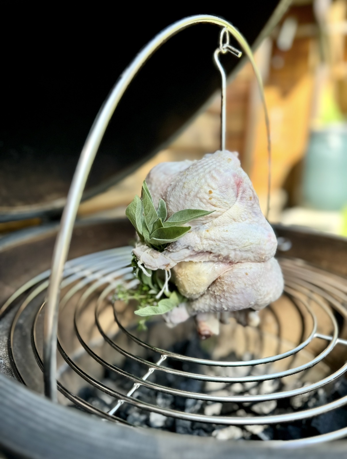 Gril předehřejte na 140 °C a vložte do něj závěsný rošt na kuře. Jakmile je teplota stabilní, rozhrňte uhlíky ke stranám grilu a kuře zavěste. Grilujte při teplotě kolem 160 °C přibližně 2,5 hodiny, dokud není maso šťavnaté a kůže zlatavá. Přejeme dobrou chuť.