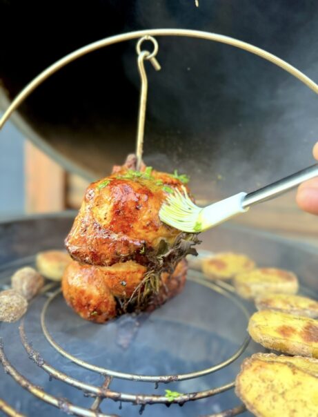 Šťavnaté grilované kuře, které 24 hodin odpočívalo v aromatickém bylinném a citrusovém nálevu. Pomalu grilované na otevřeném ohni v keramickém grilu získává nezaměnitelnou vůni, křupavou kůži a dokonale jemné maso plné svěžích tónů bylinek a citrusů!