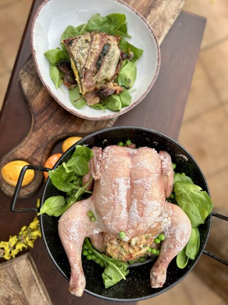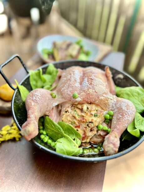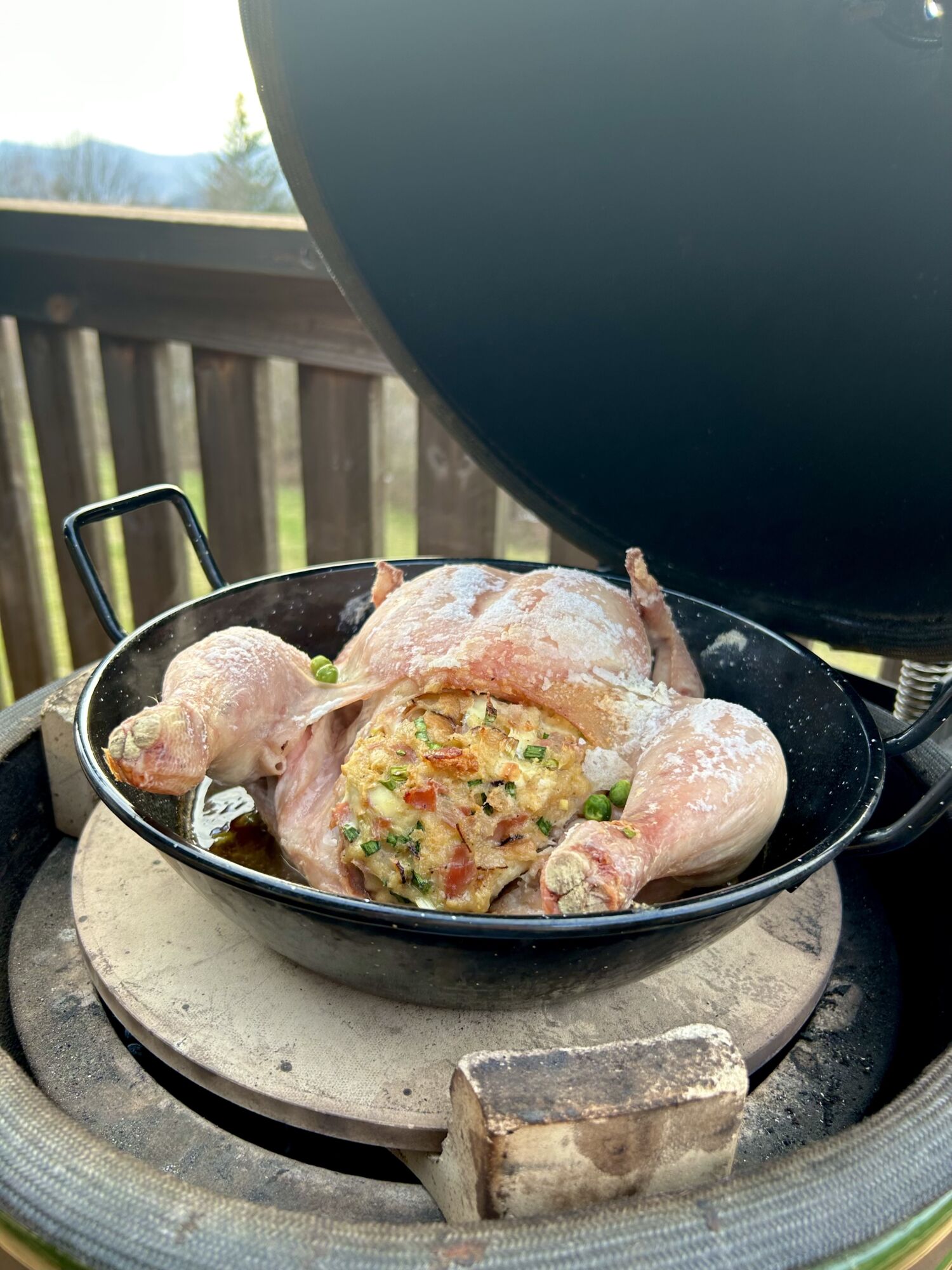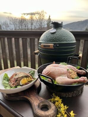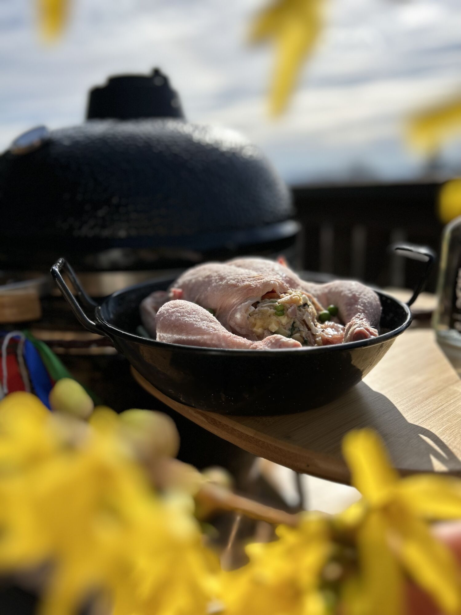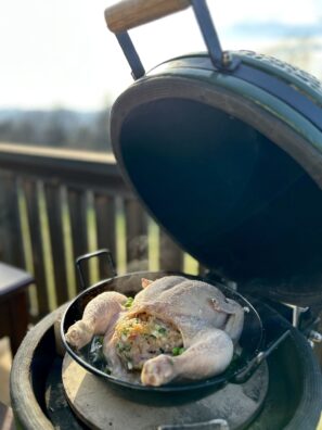 Šťavnaté kuře plněné svěží bylinkovou nádivkou, která voní po zahradě a jarním slunci. Pomalu pečené v grilu získává zlatavou kůrku a jemný kouřový tón, zatímco nádivka zůstává nadýchaná a plná chuti. Dokonalá harmonie bylinek, masa a grilovací magie v každém soustu.
