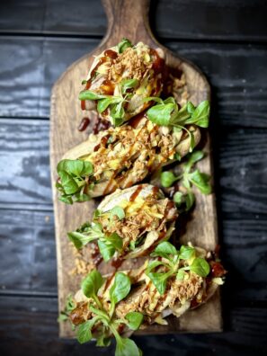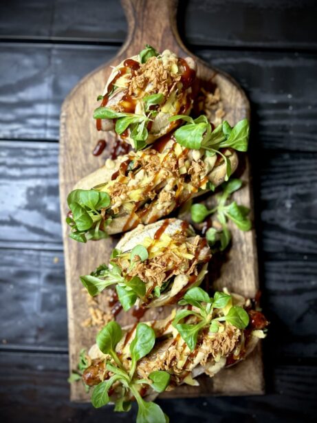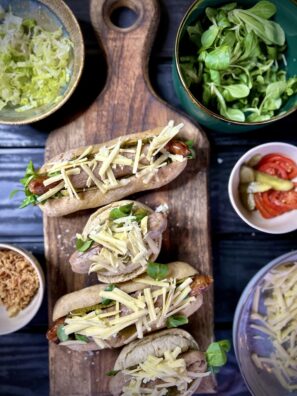 Do teplých bagetek vložte klobásy. Přidejte domácí česnekovou majonézu, sýr, polníček, okurky, rajčata, smaženou cibulku a zakápněte BBQ omáčkou. Přejeme dobrou chuť.