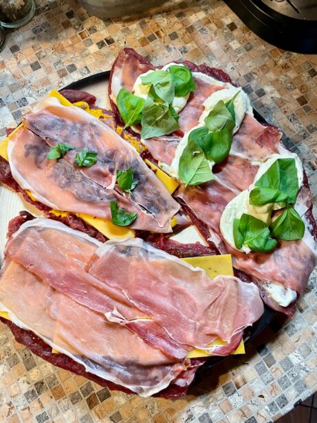 Plátky masa potřete česnekovou majonézou, poté postupně navrstvěte cheddar, pršut, mozzarellu, lístky bazalky a karamelizovanou cibuli. Nakonec vše lehce zakápněte BBQ omáčkou. Maso pevně stočte do rolády a zajistěte párátky nebo svažte potravinovým provázkem.