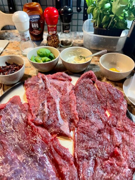 Plátky masa z obou stran lehce naklepejte, osolte a opepřete. Ideální délka je alespoň 25 cm, aby se roláda dobře balila. Maso nechte krátce odležet při pokojové teplotě.