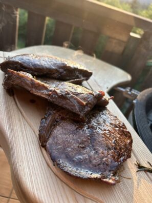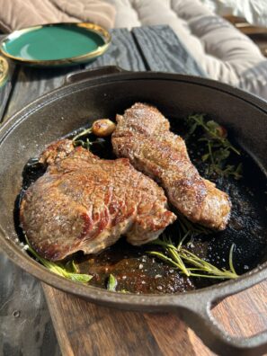 Nejvhodnější je dát maso odpočinout na 10 min do litinové pánve. Steak osolte, opepřete a položte na něj plátek másla, rozmarýn, česnek a zakryjte. Maso bude křehké a šťavnaté!. Přejeme dobrou chuť.