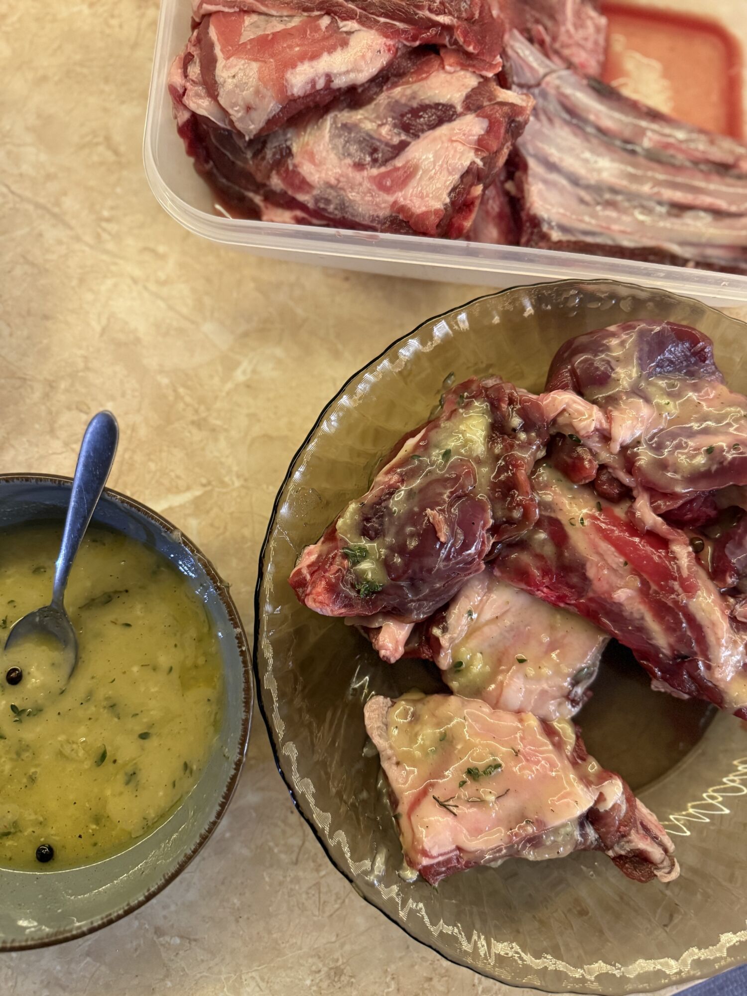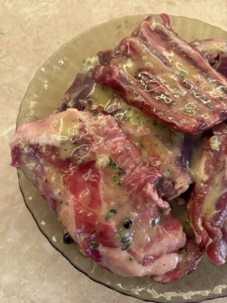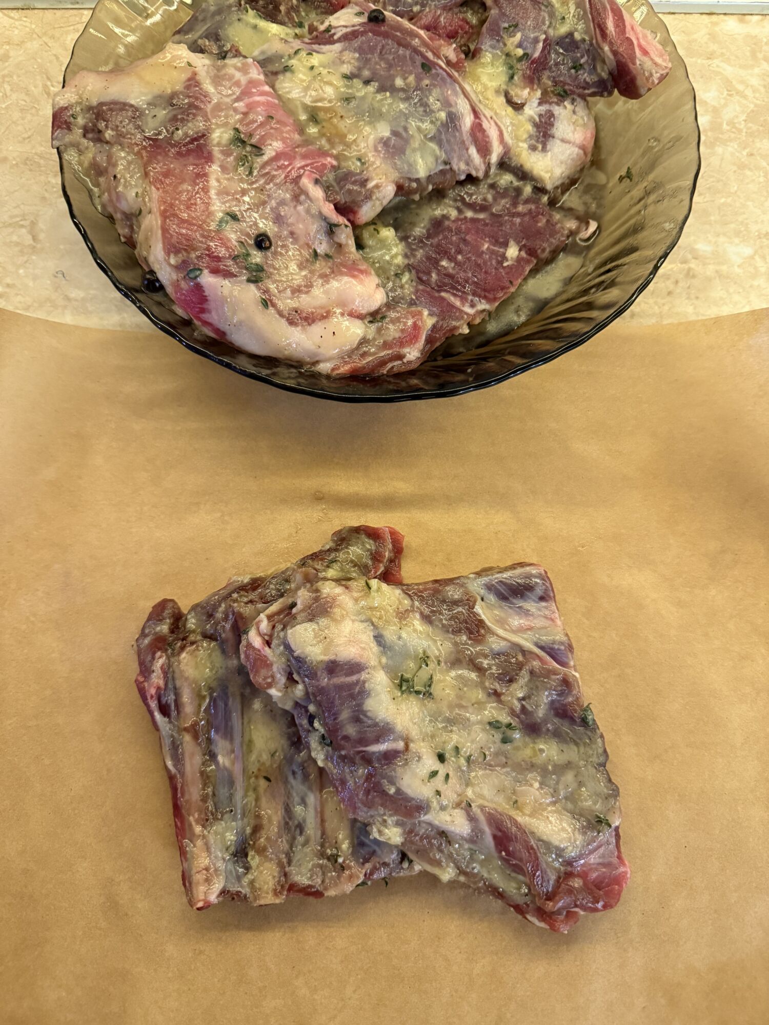 Žebra očistěte a připravte marinádu – prolisovaný česnek smíchejte se všemi ostatními ingrediencemi. Žebra pečlivě potřete marinádou ze všech stran, vložte do uzavíratelné formy a nechte odležet v lednici alespoň 24 hodin, aby se chutě propojily.