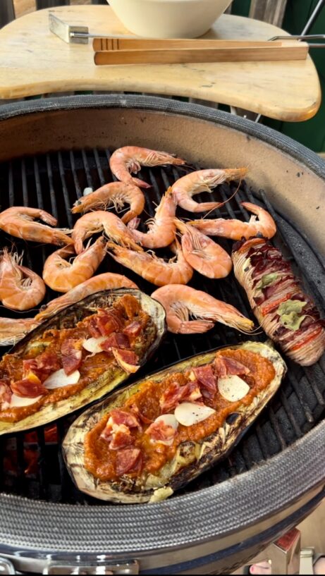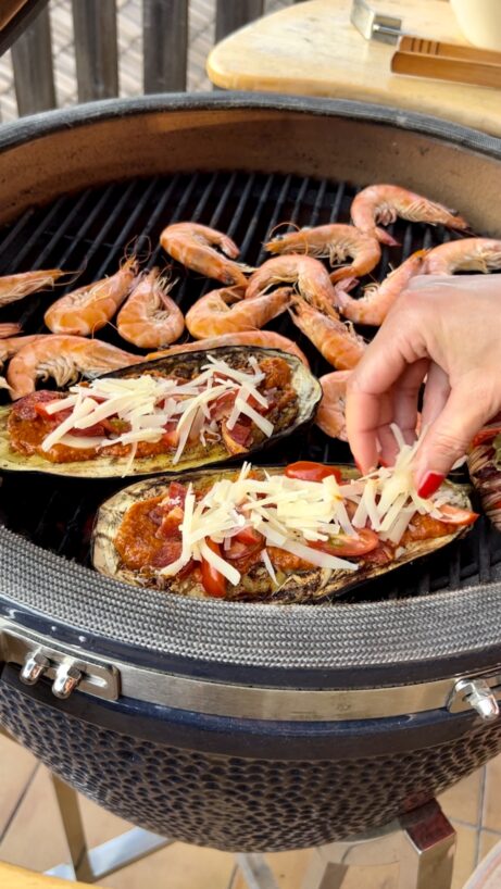Gril rozpálíme na 160 °C. Lilek položíme mřížkou dolů ke krajům grilu a grilujeme zhruba 15 minut. Poté jej otočíme, vidličkou lehce promáčkneme střed a naplníme rajčatovou směsí. Navrch rozložíme cherry rajčata, česnek a chorizo.