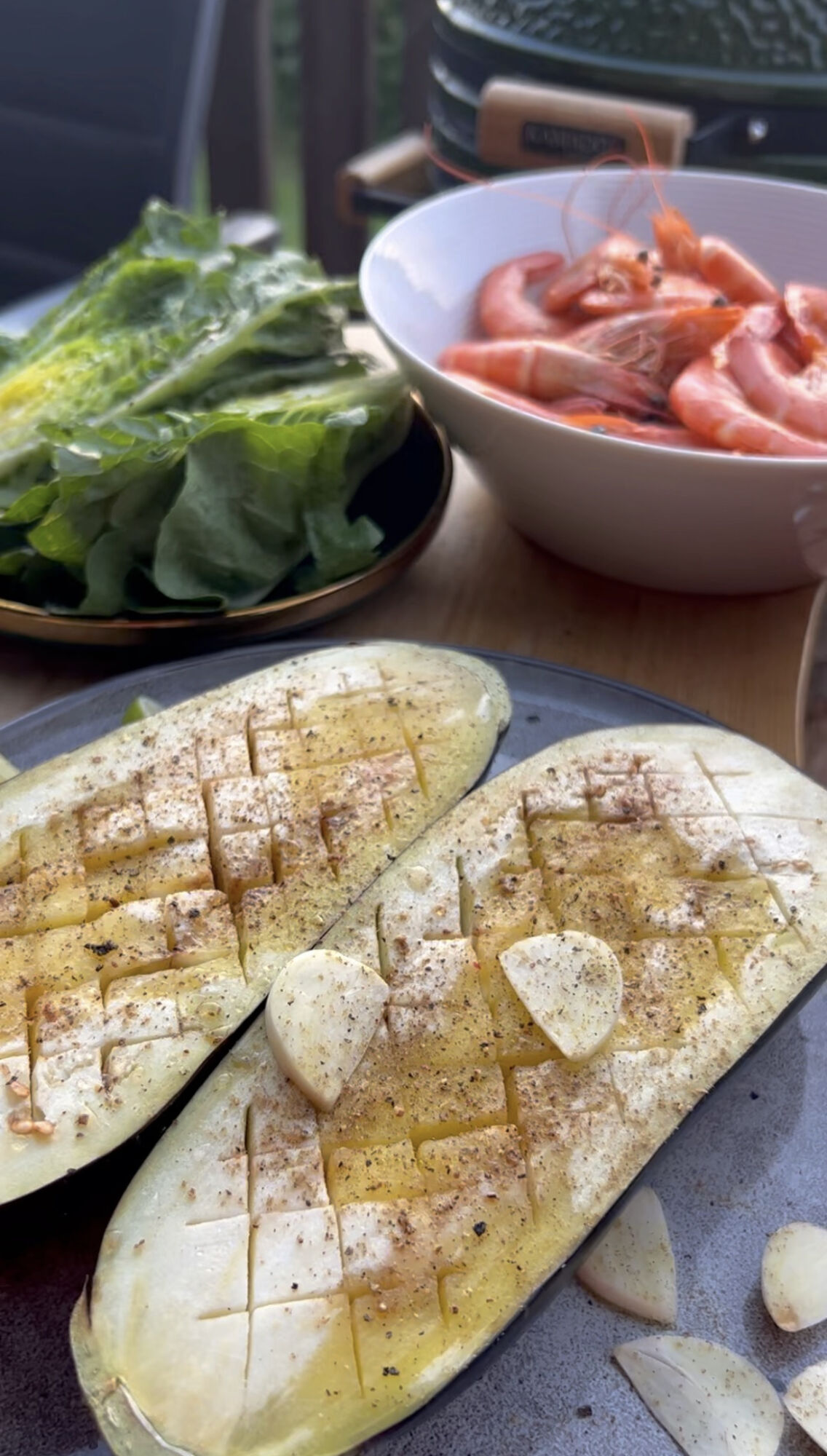 Lilek podélně rozpůlíme a nožem do dužiny vyřízneme mřížku. Osolíme, opepříme, zakápneme olivovým olejem a necháme přibližně 20 minut odležet.