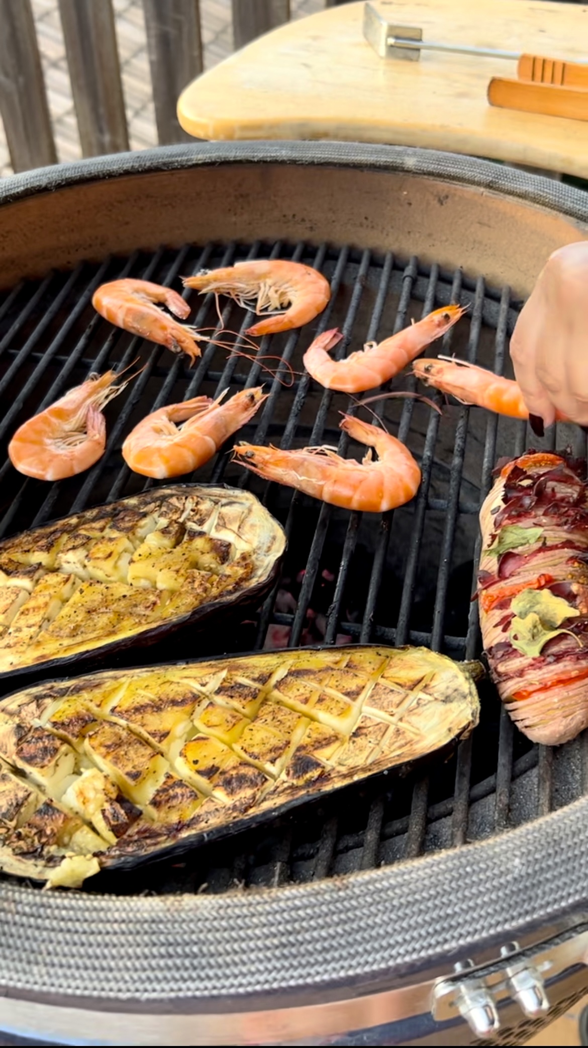 Gril rozpálíme na 160 °C. Lilek položíme mřížkou dolů ke krajům grilu a grilujeme zhruba 15 minut. Poté jej otočíme, vidličkou lehce promáčkneme střed a naplníme rajčatovou směsí. Navrch rozložíme cherry rajčata, česnek a chorizo.