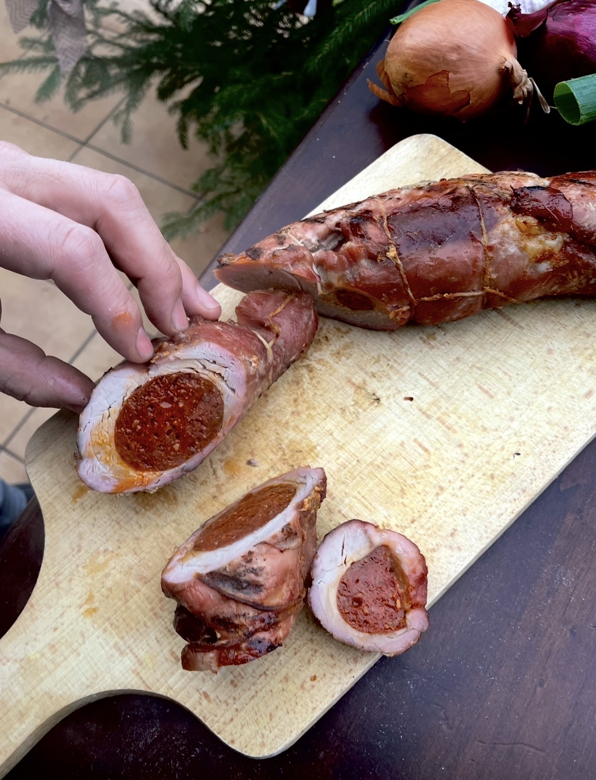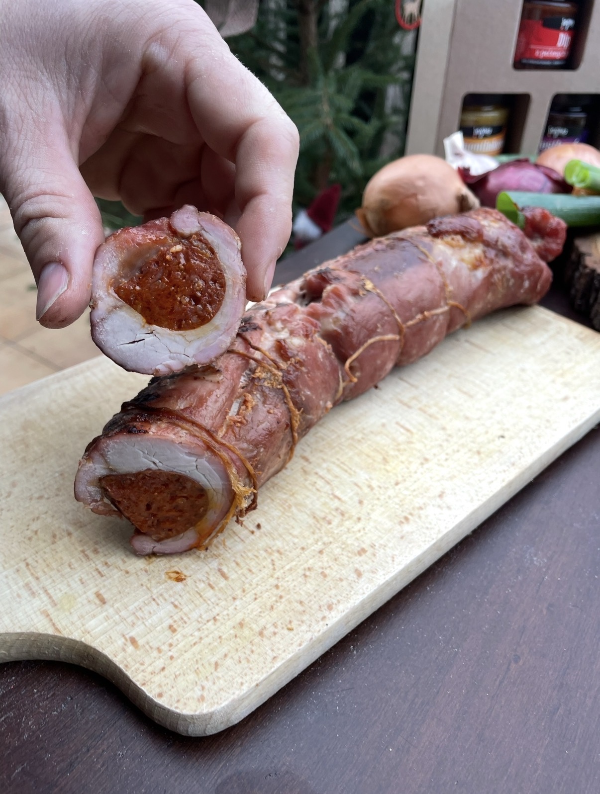 Poctivě uzená panenka, která v sobě ukrývá chutné srdce z domácí čabajky. Vůně kouře, jemnost masa a pikantní šťáva čabajky tvoří harmonii, která potěší každého milovníka tradičních uzenin. Perfektní k pivu, vínu i jako hvězda masového prkna.