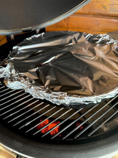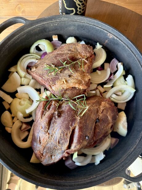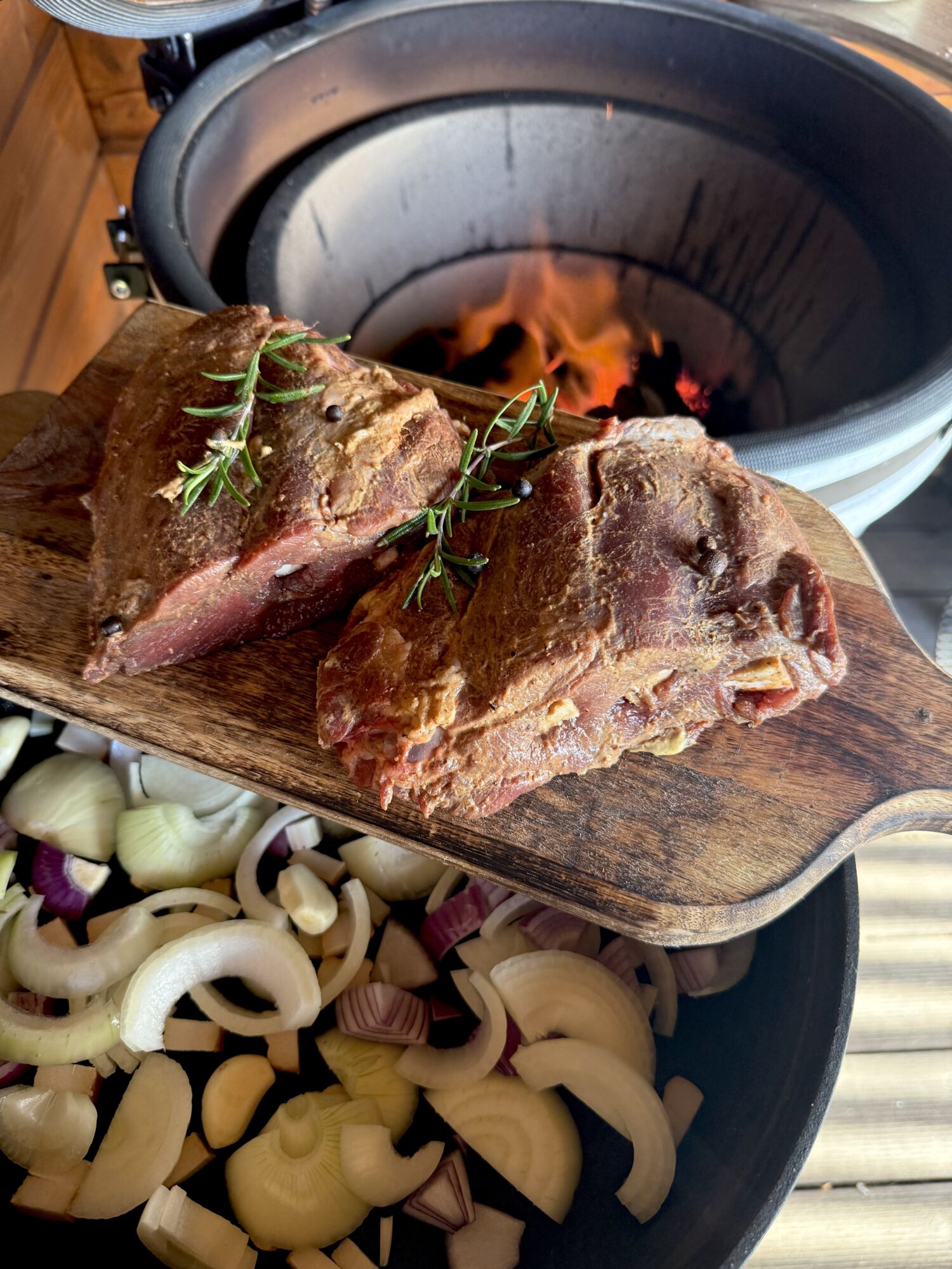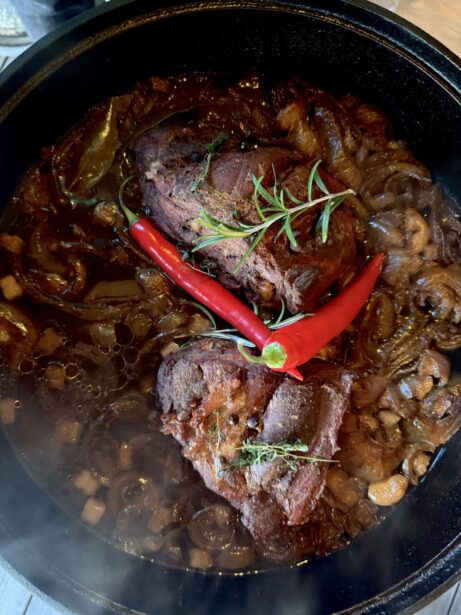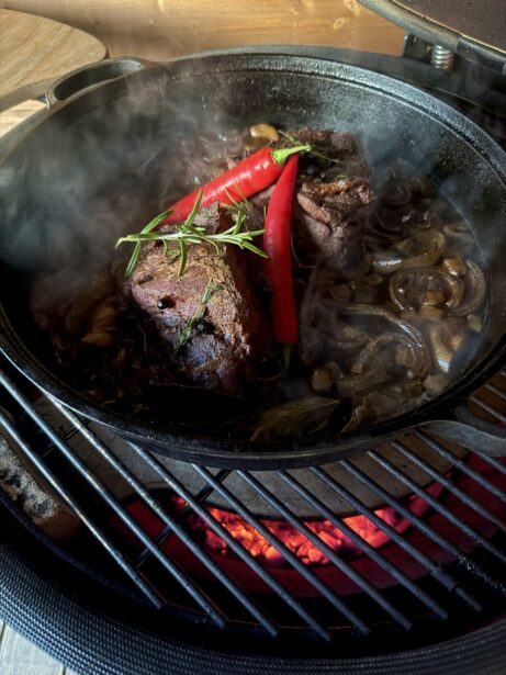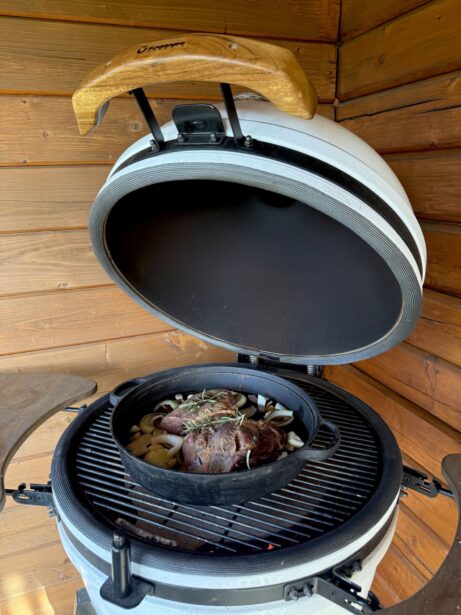 Gril rozehřejte na 150 °C. Na nepřímé grilování vložte pizza kámen a na něj položte nerezový rošt. Připravte litinovou pánev – nakrájejte do ní cibuli na hrubší půlměsíčky a přidejte stroužky česneku. Přidejte naloženou kýtu se všemi bylinkami a zalijte černým pivem. Pánev zakryjte alobalem a vložte do Kamado grilu. Pomalu pečte 3,5 hodiny, dokud maso není měkké a šťavnaté.