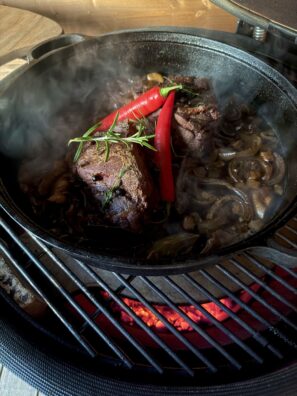 Pomalým pečením zjemněná a šťavnatá kančí kýta vyniká noblesní hořčičnou vůní, která podtrhuje její přirozeně bohatou chuť. Každé sousto se rozplývá na jazyku a odhaluje harmonii delikátních aromat a poctivého řemesla pomalého pečení.