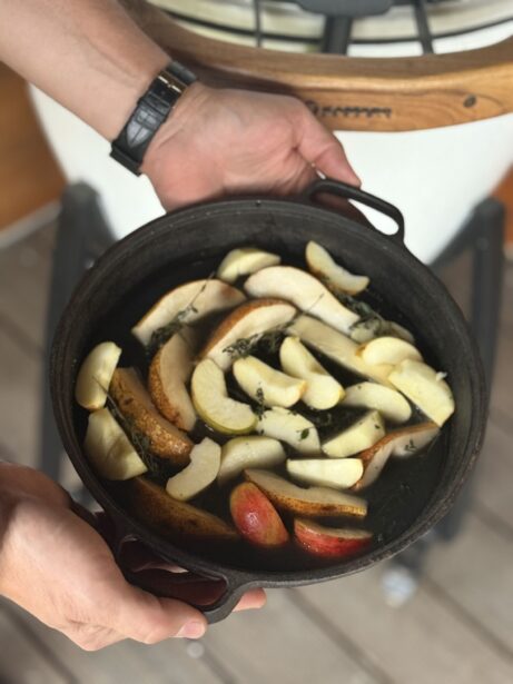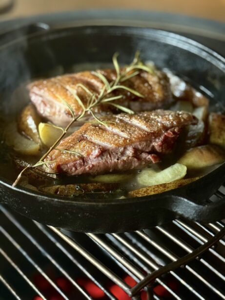 Gril předehřejte na 150 stupňů. Do zadní části grilu vložte přídavný rošt, na něj dejte litinu s ovocem, podlijte vínem, přidejte bylinky tymiánu a rozmarýnu. Kachní prsa grilujte kůži dolů. Po prvních 5 minutách maso v grilu pootočte a nechte dalších 5 minut ať se kůže propeče. Po 10 minutách kůži dolů prsa otočte a nechte ještě 5 minut propéct maso.