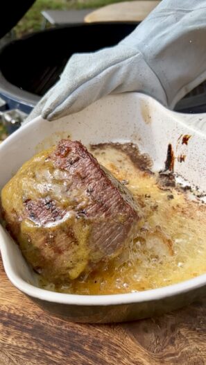 Do grilu vložíme pizza kámen a snížíme teplotu na 150 °C. Jakmile je teplota stabilní, vložíme dovnitř kameninu či litinu s masem, přidáme máslo a přikryté alobalem necháme péct přibližně 10 minut.