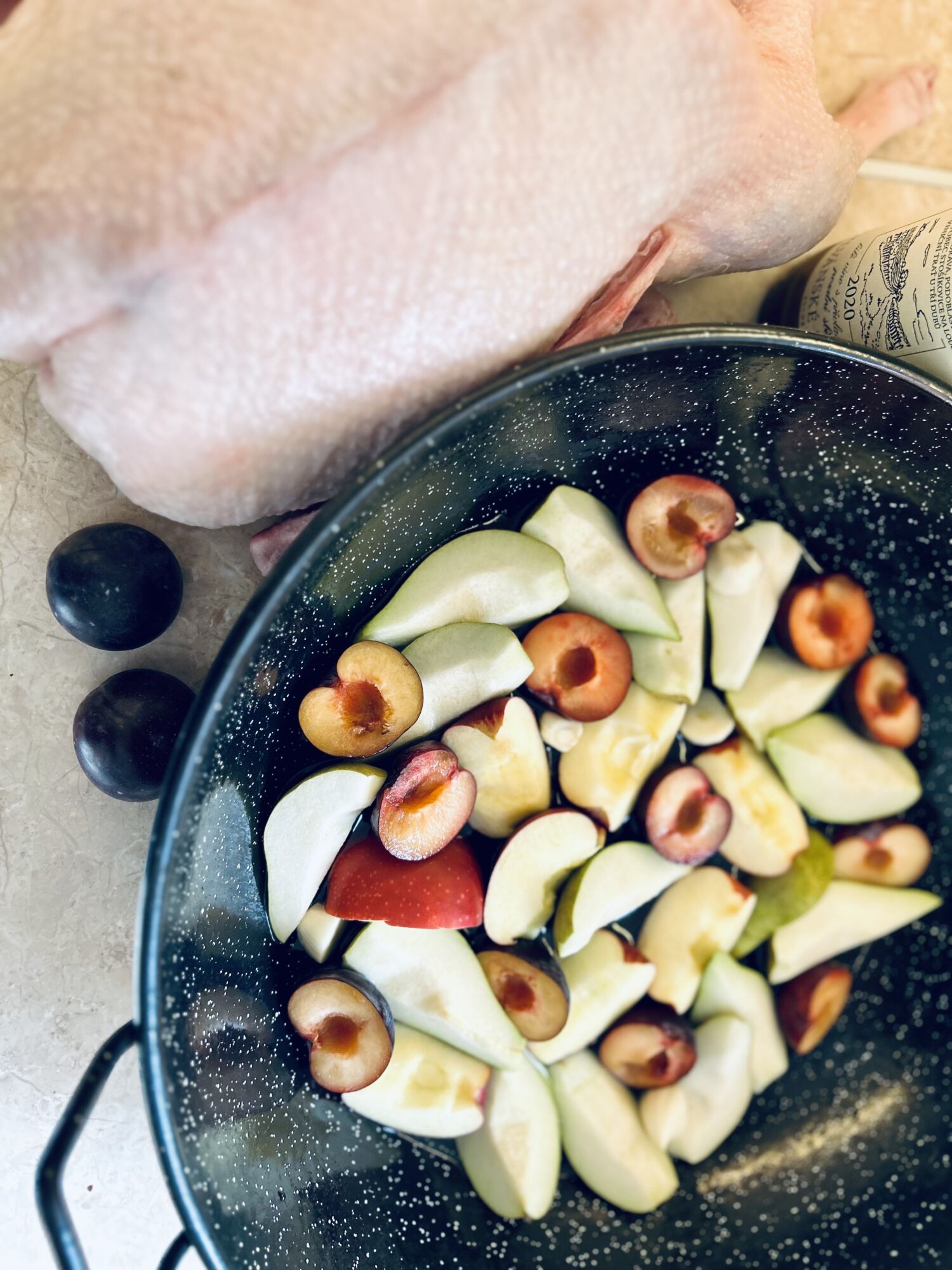 Rubínově glazovaná husa na placato s jablky a švestkami