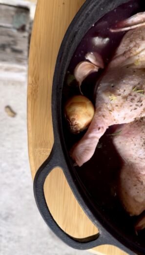 Husa pečená na placato v litinové pánvi, kde se pomalu propéká v aroma česneku, cibule a sladkých švestek s jablky. Dokonalou chuť doplňuje jemná rubínová glazura z červeného vína, která masu dodává sametovou vůni i šťavnatou, hlubokou chuť.