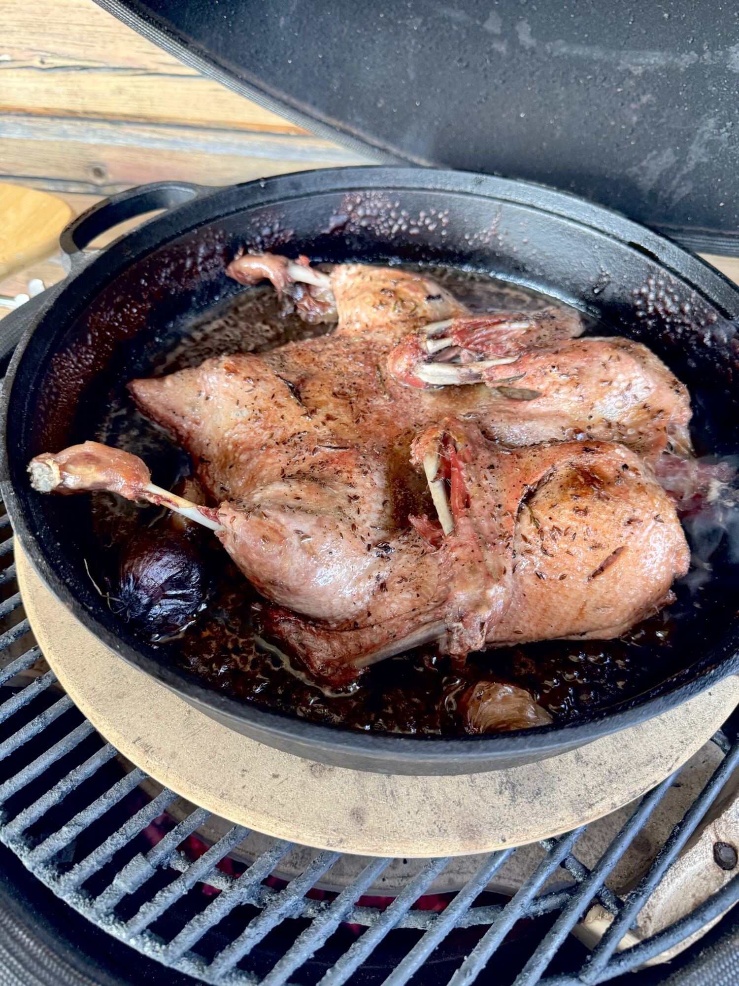 Husu necháme krátce temperovat při pokojové teplotě, poté ji dochutíme pepřem, kmínem a tymiánem a položíme do připravené litinové pánve k ovoci. Pánev zakryjeme alobalem a vložíme do vyhřátého grilu.