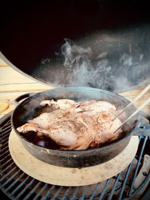Druhý den rozpálíme gril na 160 °C. Do grilu vložíme kámen na nepřímé grilování (nohami nahoru), nerezový rošt a pizza kámen.