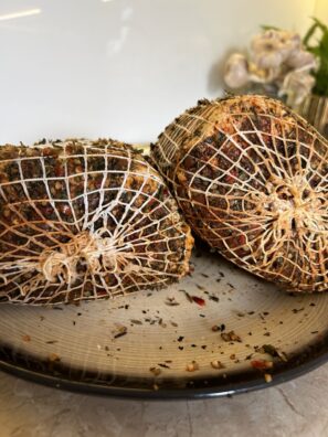Vepřovou krkovici důkladně omyjte a osušte. Maso v pokojové teplotě na 7 dnů nasucho naložte do mořské soli (5 g na 1 kg masa) a čerstvých bylinek, např. tymián a medvědí česnek, přidejte pepř a trošku strouhaného muškátového oříšku, a vše promíchejte v hmoždíři. Bylinky můžete samozřejmě volit podle vaší chuti.