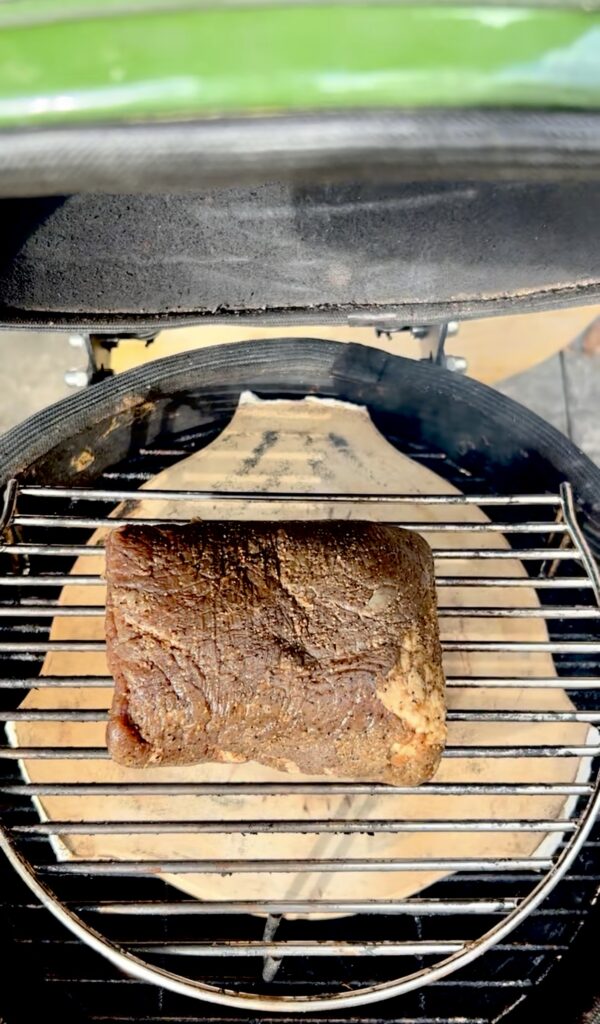 3. Gril rozpálíme na 75 °C, vložíme kámen pro nepřímé grilování a přídavný rošt. Jakmile je teplota stabilní, maso vybalíme z fólie a položíme na rošt. Během uzení průběžně kontrolujeme teplotu a udržujeme ji konstantní. Po zhruba 5 hodinách je hovězí hotové.